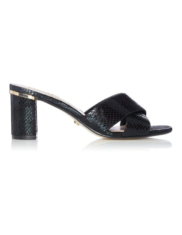 This sandal is the perfect choice for adding to your party line-up. In a classic slip on style it has hardware wrapped around the block heel. Finished with an open sandal toe and stylish cross over upper straps.