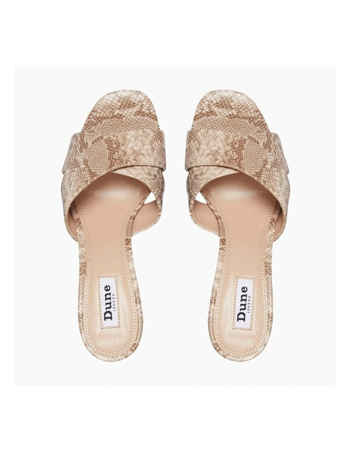 This sandal is the perfect choice for adding to your party line-up. In a classic slip on style it has hardware wrapped around the block heel. Finished with an open sandal toe and stylish cross over upper straps.