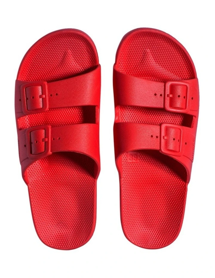 Freedom Moses are all about celebrating summer 365 days a year. Freedom Moses slides are vegan, cruelty-free and injected with air so you feel like youre walking on a cloud. All slides are lightly scented with milk and honey, helping you feel calm and carefree throughout the day.