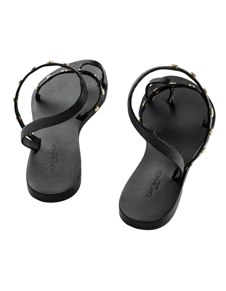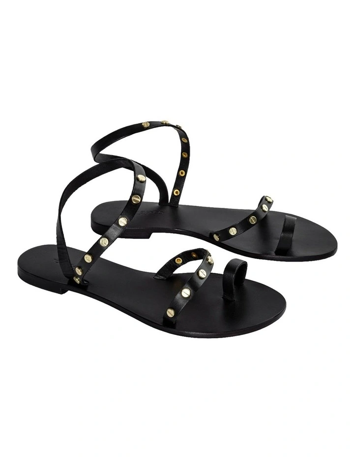 A black leather sandal with a toe ring, strap across the strap and ankle halter with gold-toned hardware.